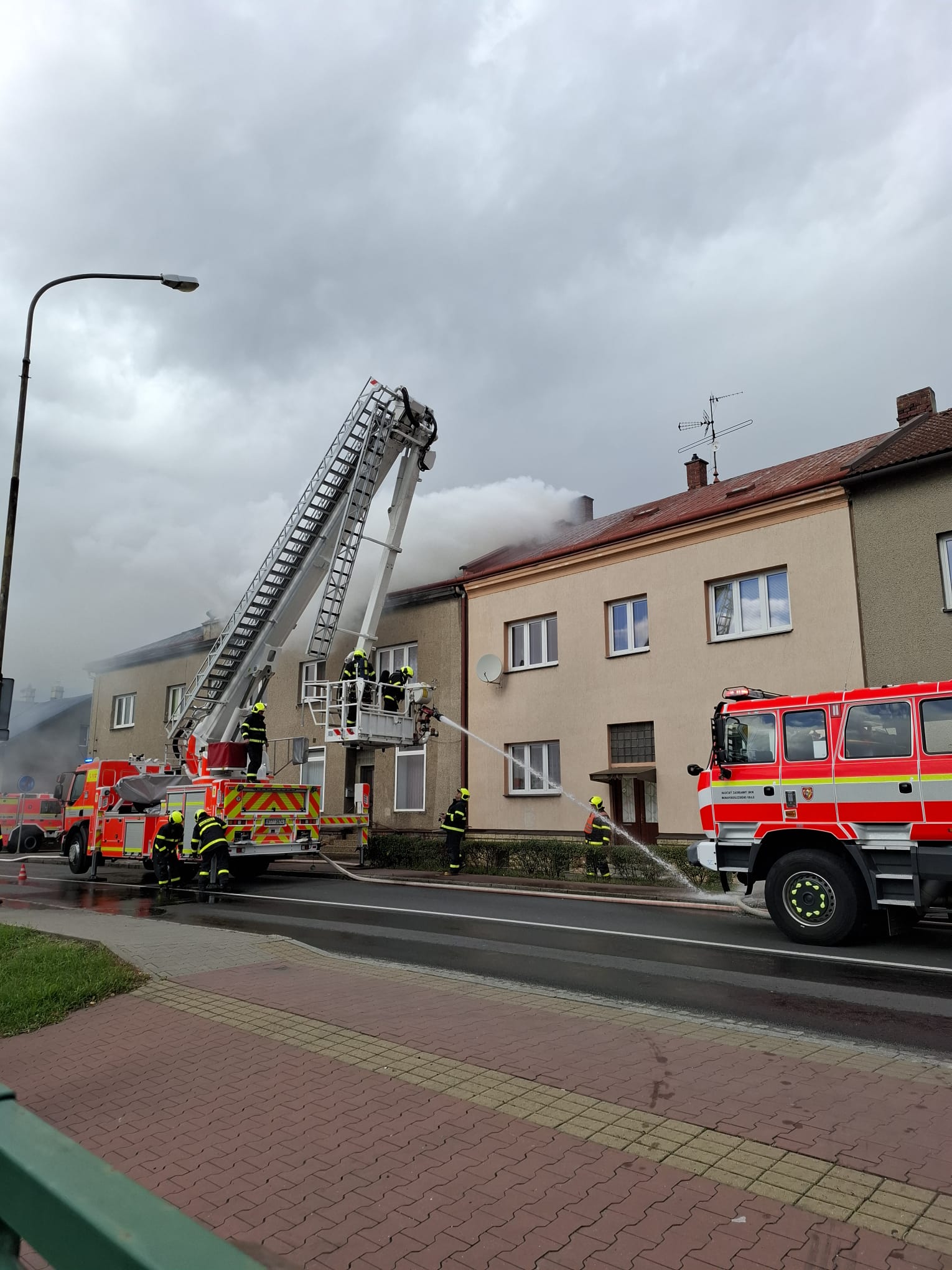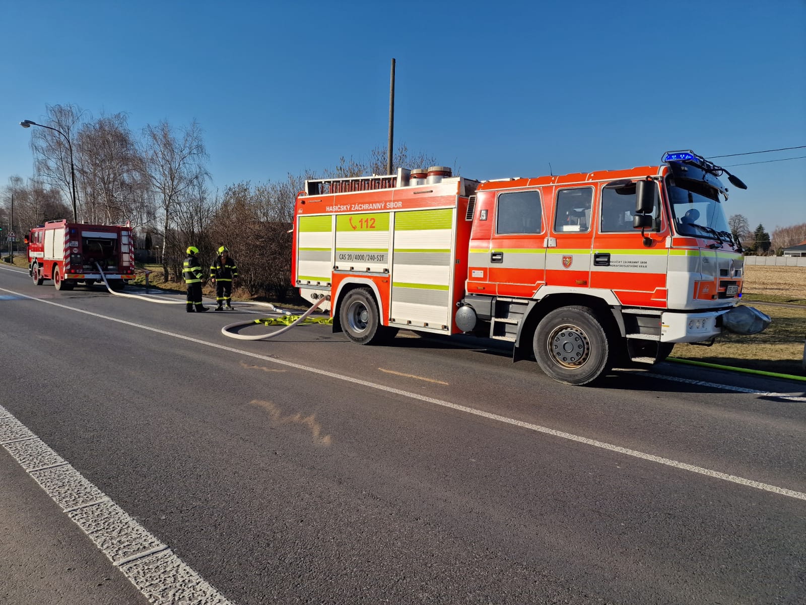 Popis zásahu : Po příjezdu na místo zjištěn rozvinutý požár dvojgaráže garáže, která byla přistavěna k obytnému domu. Od požáru garáže se postupně rozvíjel požár obytného domu, jak bytových jednotek, tak i sedlové střechy domu. Na místě kooperace s zasahujícím HZS MSK Bohumín, Orlová a Karviná. Po uhašení požáru naše jednotka zajišťovala dozor na požářišti s termokamerou a dohašovala skrytá ohniska k krovech střechy budovy. V 22h byl dohled ukončen a jednotka se po doplnění cisterny vrátila zpět na základnu.
